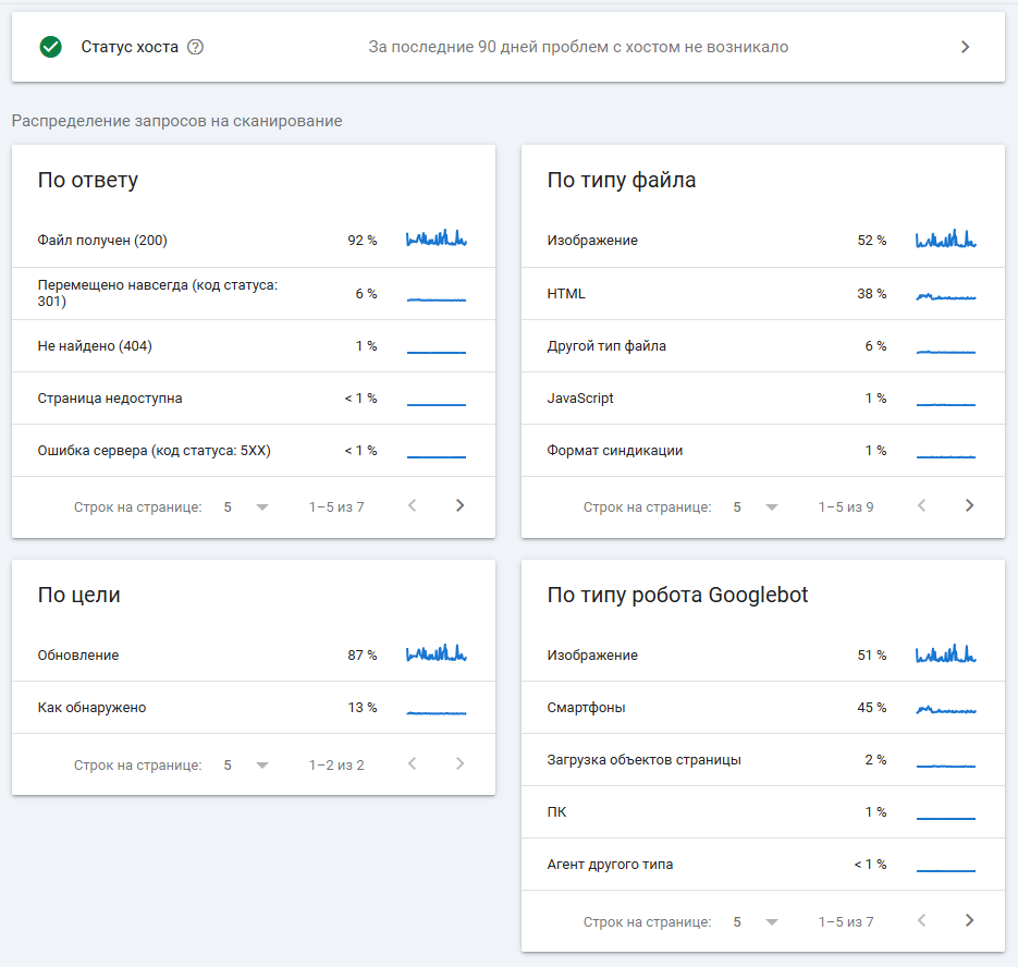 Сканирование. В этом подразделе содержится отчет о сканировании файла robots.txt и общая информация о статистике сканирования ресурса – количество запросов робота Google к сайту за последние 90 дней. По ссылкам можно перейти на детальные отчеты.