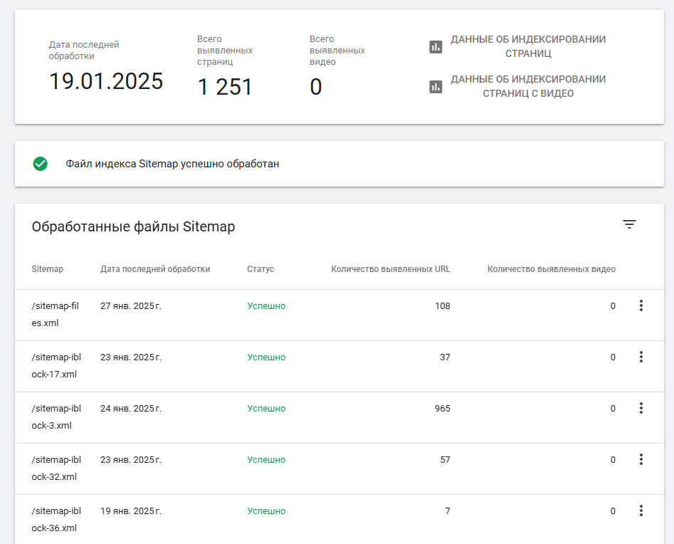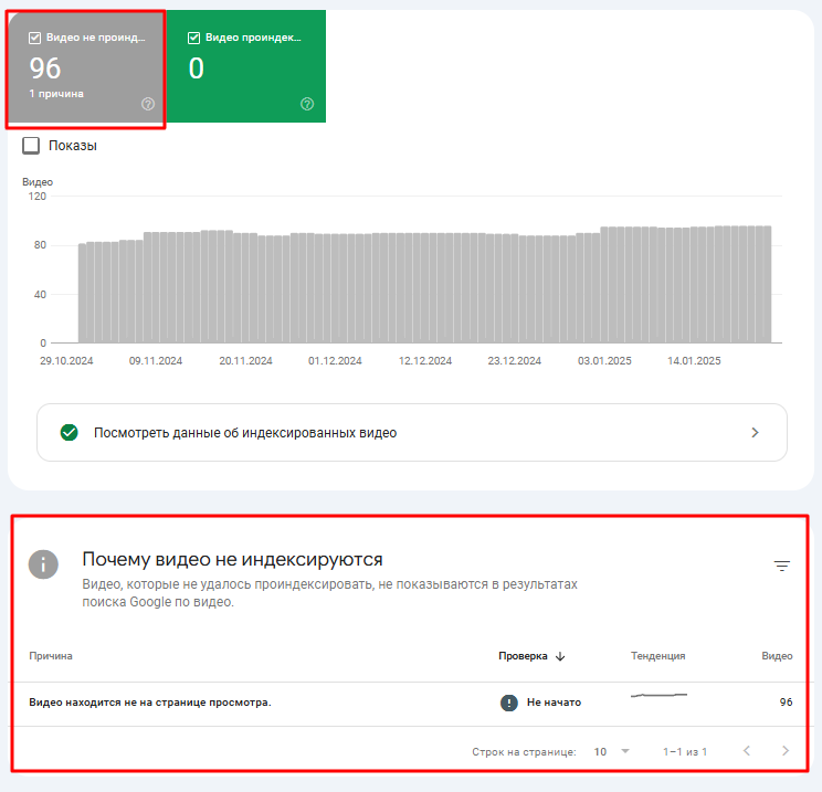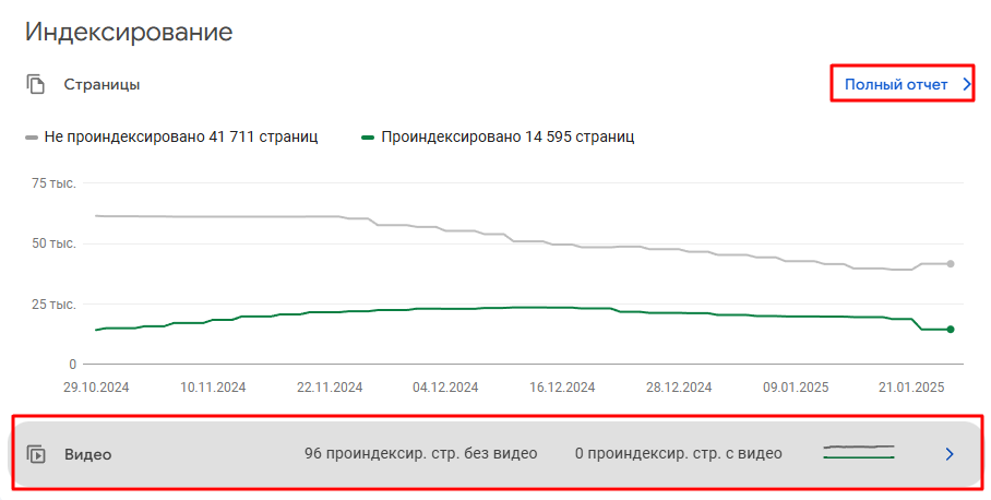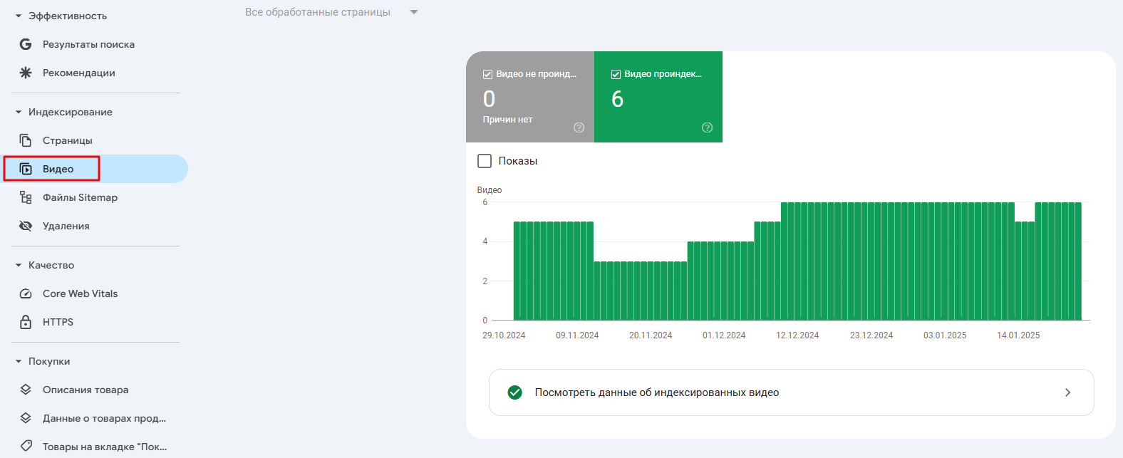 Индексирование. Показывается количество проиндексированных страниц. Отдельно есть ссылка на отчет о проиндексированных страницах с видеороликами.