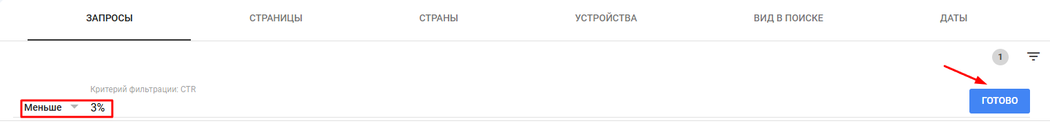 Отфильтруем запросы, у которых CTR меньше 3%. Кликаем на «Готово»: