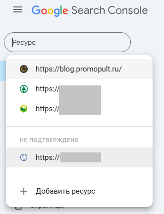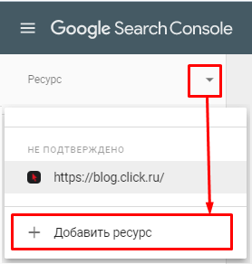 Если нужно добавить в Search Console еще один ресурс, разворачиваем список напротив надписи «Ресурс» и выбираем «Добавить ресурс»: