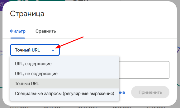 В выпадающем списке выбираем «Точный URL» и указываем адрес: