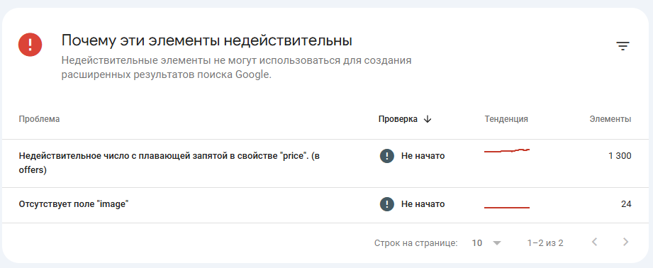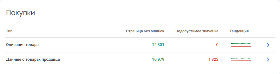 Данные в отчете организованы так же, как в предыдущем. В нем можно посмотреть ошибки в микроразметке данных на страницах карточек товаров.
