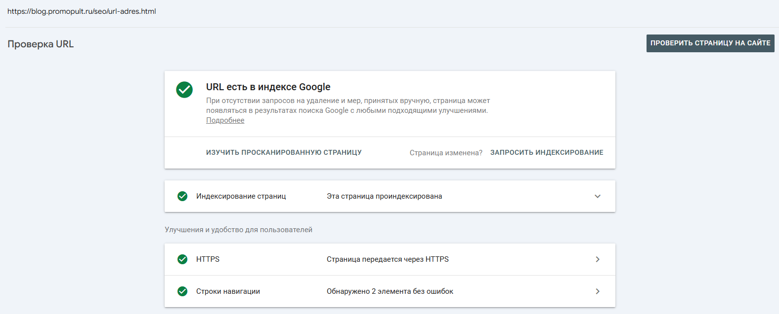 По результатам проверки мы видим, что никаких ошибок не обнаружено: URL есть в индексе Google, страница оптимизирована для мобильных устройств, ошибок в строках навигации и использовании HTTPS нет.