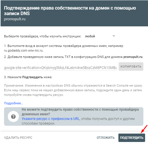 Подтверждаем права собственности на домен. Для этого копируем запись TXT и добавляем ее в конфигурацию DNS своего домена. Кликаем «Подтвердить».