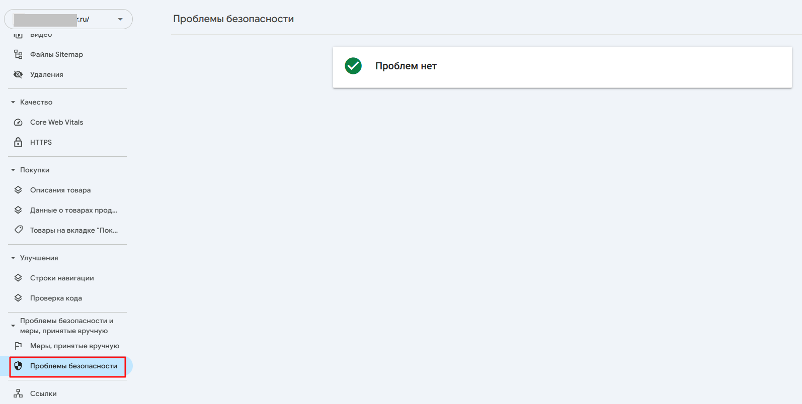 Перейдем в отчет «Проблемы безопасности». Он содержит сведения об опасном контенте на страницах сайта: вирусах и другом нежелательном ПО, программах, которые вводят пользователей в заблуждение и т. п.