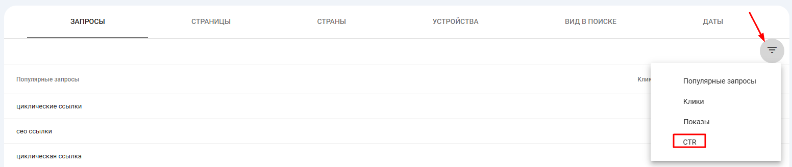 Переходим к таблице со статистикой по запросам. Нажимаем на значок фильтра и в выпадающем меню выбираем пункт «CTR»: