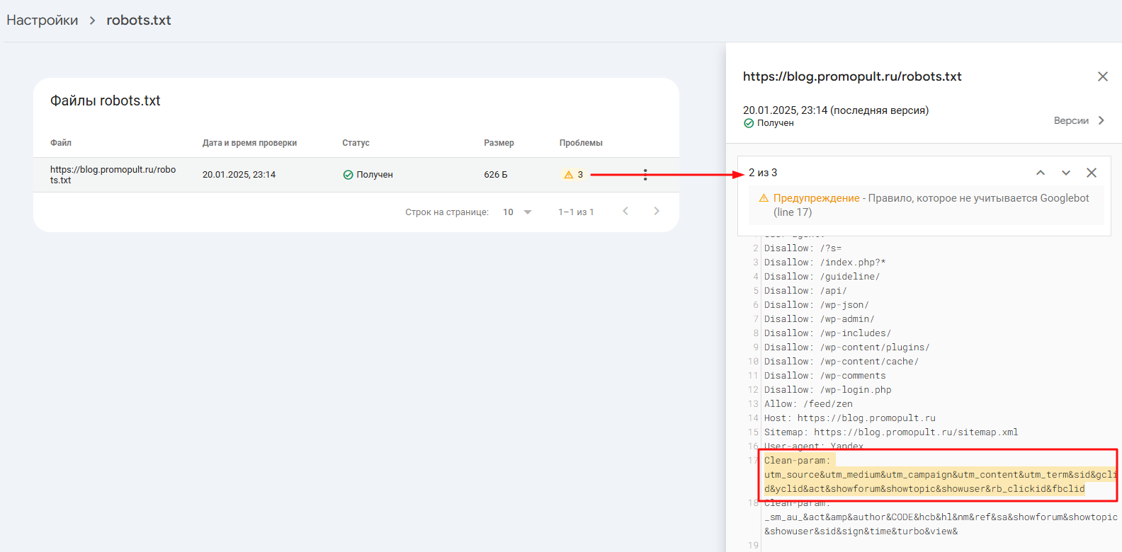 Отчет о сканировании robots.txt: по клику на значок в столбце «Проблемы» переходим к их описанию