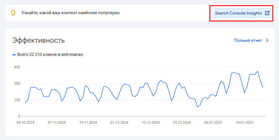 Перед сводками размещена ссылка на бета-отчет Search Console Insights:
