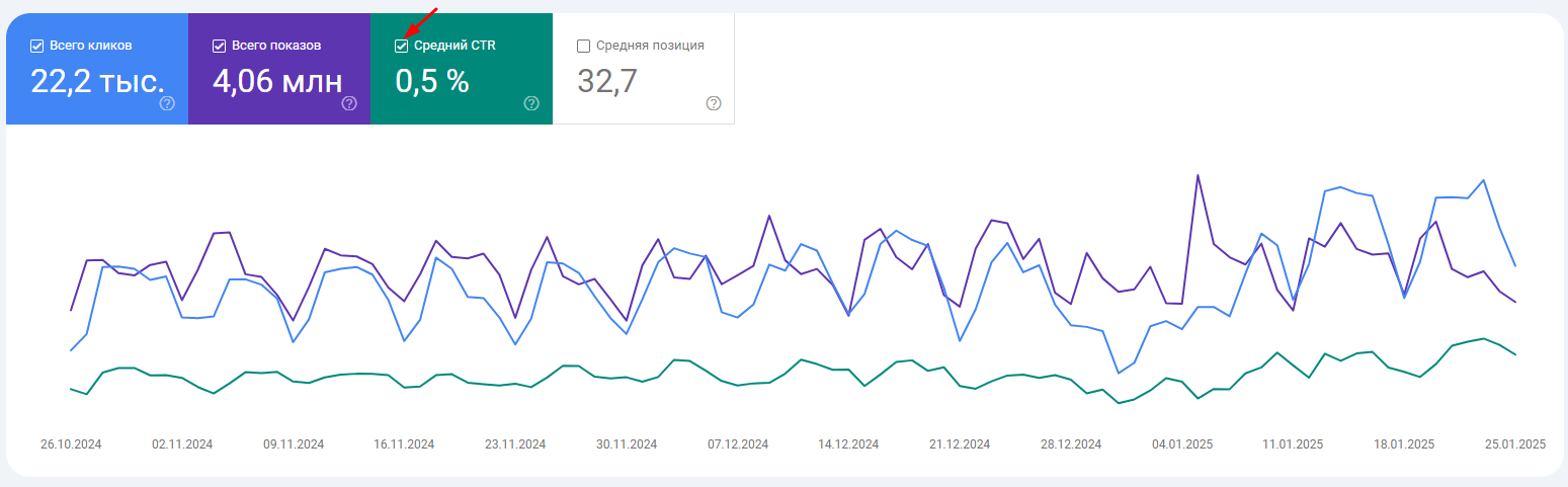 Например, добавим на график показатель CTR. Для отображения показателя поставим галочку в блоке «Средний CTR»: