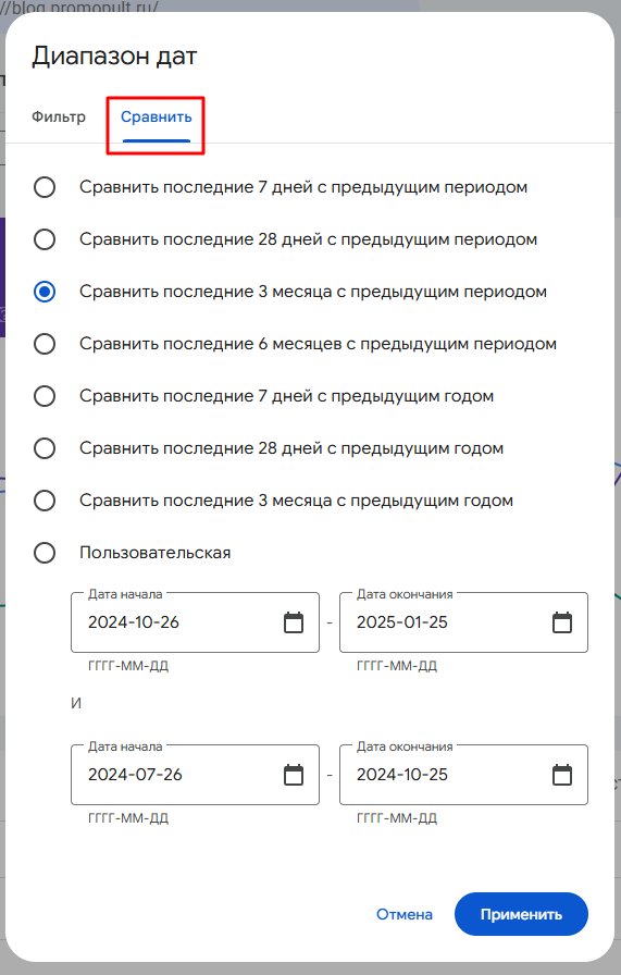 На вкладке «Сравнить» можно задать периоды сравнения: